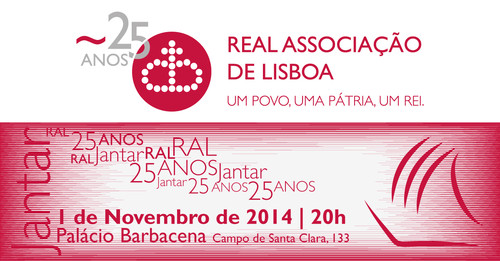 A Real Associação de Lisboa vai festejar os seus 25 anos de existência no próximo dia 1 de Novembro, a partir das 20:00, com a realização de um jantar presidido por Sua Alteza Real o Senhor Dom Duarte, Duque de Bragança, e que terá lugar no Palácio Barbacena (Campo de Santa Clara, 133, Lisboa).