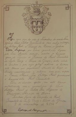 Imagens dos termos do livro dos Irmãos de Honra da Real Irmandade com as páginas assinadas por SSAA os Príncipes Senhor D. Afonso e Senhora D. Maria Francisca no passado dia 9 de Novembro no final da Festa de Nossa Senhora e Investidura de novos Irmãos da Real Irmandade da Santa Cruz e Passos da Graça.