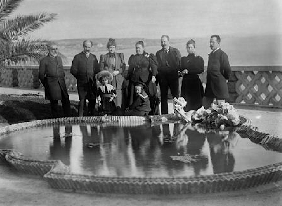1894: Temos da esquerda para a direita o Duque de Loulé, Duval Teles, Rainha D. Maria Pia, dois desconhecidos, Marquesa de Unhão, Alfredo de Albuquerque. As crianças são os Príncipes D. Manuel e D. Luis Filipe no jardim do Chalet do Estoril. "Perpectiva que nos permite conhecer a vista alcançada do Paço do Estoril - actualmente a Marginal passa por baixo. A autoria pode ser atribuída a D. Carlos ou a D. Afonso, ambos presentes neste dia 23 de Fevereiro" In Fotobiografia Maria Pia de Sabóia