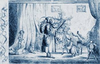 Eram assim as noites de Natal da família real em meados do século XIX. D. Fernando II, marido da rainha D. Maria II e pai dos seus sete filhos, representava nas suas gravuras e águas-fortes o ambiente familiar, com ele próprio vestido de S. Nicolau a distribuir presentes. Mas o que é significativo na imagem é o facto de, segundo se crê, ela ser a primeira representação de uma árvore de Natal em Portugal.