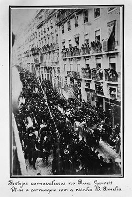 Rainha Dona Amélia na sua carruagem - Festejos de Carnaval na Rua Garrett