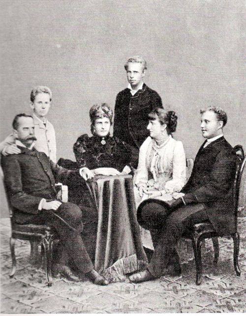 Maria Pia com os seus filhos, Afonso e Carlos. Acompanham-na também Umberto I e Margarida de Itália e o príncipe Vítor Emanuel de Nápoles