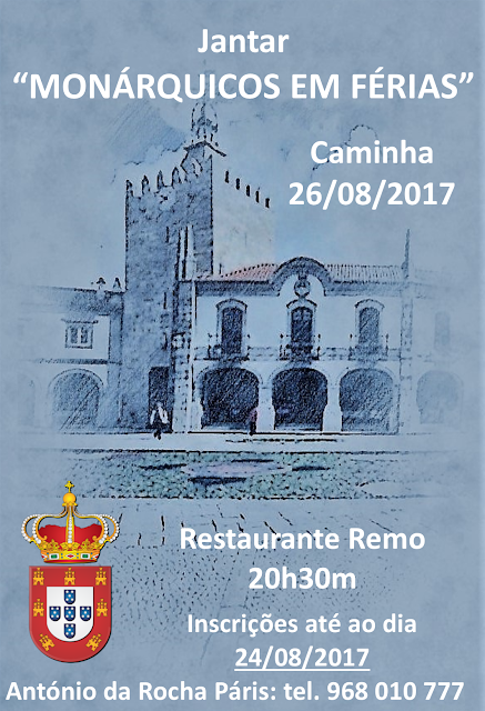 A pedido do nosso associado e membro da Direcção da RAVC, António da Rocha Páris, informamos que no dia 26 de Agosto às 20h30m, no Restaurante Remo em Caminha, terá lugar o tradicional Jantar "Monárquicos em Férias", que este nosso correlegionário vem organizando ao longo destes últimos anos.